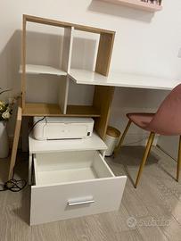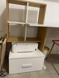 Scrivania bianca e rovere di 150 cm con cubotti che possono essere utilizzati come libreria e cassettone grande