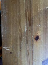Scrivania con ripiano estraibile per tastiera, mensole a giorno e cassettoni, bianca e legno naturale, presenta segni di uso ma non ha danni