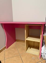 Vendo scrivania color rosa con piano sagomato. Include un modulo laterale a giorno in legno chiaro con due ampi ripiani per libri o zaino.