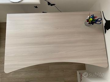 Vendo la scrivania come da foto, adatta per camera o per studio. Piano in color legno chiaro di spessore 3,5 cm e gambe in acciaio verniciato bianco. Larghezza 120 cm, profondità 63 cm nella parte centrale e 72 alle estremità arrotondate, altezza del piano 73,7 cm. Conservata molto bene e in ottime condizioni. Le gambe sono smontabili e diventa facilmente trasportabile in macchina; per rimontarle basta un semplice cacciavite.