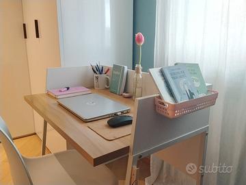 Scrivania compatta dal design minimal e stile scandinavo. Linee pulite, bianco e legno chiaro, minimo ingombro massima resa estetica.