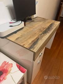 Scrivania scorrevole moderna ed essenziale, adatta sia in ufficio che in camera, realizzata in legno melaminico bianco larice con piano superiore acero. Dimensione ingombro 100x60x75 cm (dimensioni esatte in ultima fotografia).