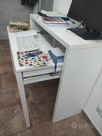 Scrivania salvaspazio per home working, poco profonda, la parte inferiore per la tastiera si richiude verso il muro. Due cassetti. larghezza 98,5, profondità chiusa 36,5. profondità aperta