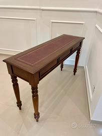 Elegante è stupendo scrivania scrittoio con struttura tutta in legno massello intagliato finitura noce con piano in pelle con greca in oro . Spedizione italia