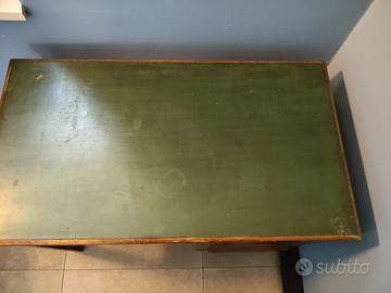 Massiccia scrivania scrittoio in noce colore scuro Piano con inserto in ecopelle verde 5 cassetti lato destro Misure: Profondità 50 cm Altezza 70 cm Lunghezza 90 cm'