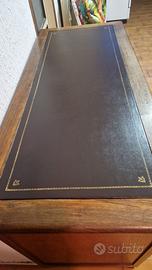 Scrivania/scrittoio in legno (epoca anni 50) 120x55 con 3 cassetti e 2 antine. Piano scrivania con inserto in pelle marrone, con serigrafia fiorentina in oro. Cassetti rivestiti internamente,con chiusura a chiave. Antine con chiusura a chiave. Ritiro a carico dell'acquirente.