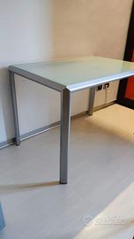Piano in vetro satinato e struttura in metallo con angoli smussati.