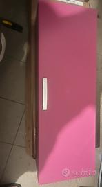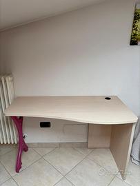 Vendo per non utilizzo, scrivania, sedia girevole, cubo contenitivo e mensola poggia libri firmati Moretti Compact, colore fuxia e legno chiaro.