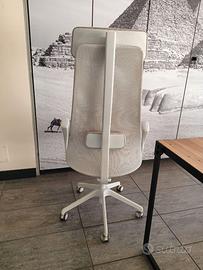 Scrivania in stile industrial, sedia in tessuto e cassettiera 6 cassetti in metallo.