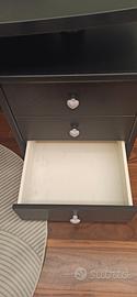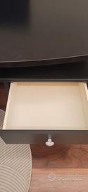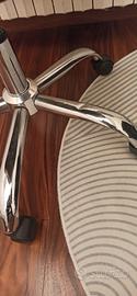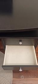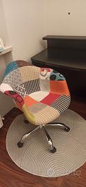 Scrivania moderna in legno con piano a semicerchio, mensola rialzata e cassettiera a tre cassetti spaziosi con pomelli in ceramica lilla a forma di cuore. Designer asimmetrico e minimalista. Il piano di lavoro e sostenuto su un lato da una gamba a pannello e sull'altro da un supporto a forma di cono che poggia sopra la cassettiera. Dimensioni 140m per 69 nella parte più ampia. Stabile e robusta. Condizioni buone. Presenta qualche graffio dovuto all'uso e i cassetti internamente andrebbero lavati accuratamente. Comprende una sedia Patchwork, in ottime condizioni, in tessuto imbottita girevole con rotelle, larga 63 cm. La base cromata presenta delle imperfezioni (vedi foto). Un tappeto rotondo con motivo geometrico a cerchi. Ritiro a domicilio, causa dimensioni.