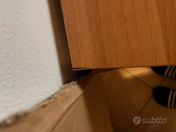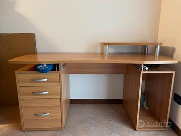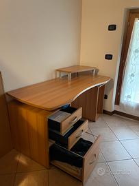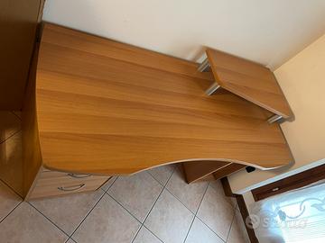 Scrivania spaziosa e resistente Misure scrivania: P 69 L 150 H 72 Misure alzata: P 25/40 L 59 H 13,50 Piccolo difetto come da foto, riparabile comuqnue con hn li di colla adatta