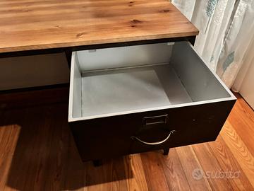 Vendo scrivania in stile industriale di Maisons du Monde, realizzata in metallo e legno di abete. Acquistata a maggio 2022, è stata usata pochissimo, praticamente come nuova. Il piano presenta solo due piccoli difetti (visibili in foto), già presenti al momento della consegna. Vendo per inutilizzo. Prezzo di acquisto: 250€.