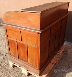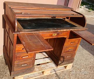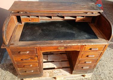 Scrivania stile Liberty, presenta due file di cassetti laterali e un cassetto centrale. Scrittoio estraibile e due vani porta documenti estraibili laterali. Richiede interventi di restauro e lucidatura. Ritiro in loco.