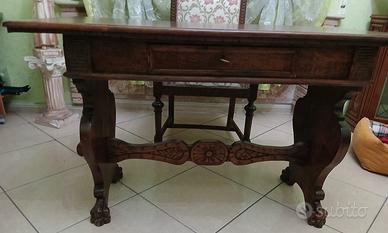 vendesi scrivania stile rinascimento antica con intarsi fatti a mano con zampe di leone con cassetto estraibile in ottime condizioni facile da caricare con parcheggio al portone e ascensore entra anche in una macchina più regalo poltrona imperiale antica in legno massello con intarsi fatti a mano.