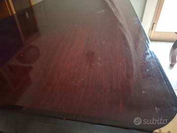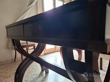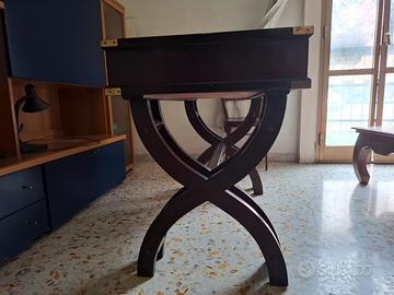 È una scrivania in stile "Campaign" stile marina in legno scuro rosso mogano lucido con dettagli in ottone (da viaggio o militare) con una particolare base a "X" .