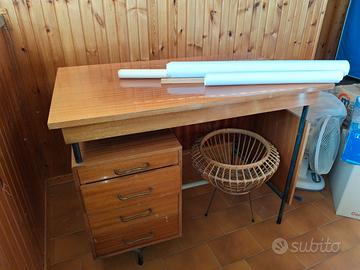Scrivania svedese in legno e metallo con cassetti. La particolarità è che il piano scrivania si alza rimanendo orizzontale e consente di accedere al vano sottostante. Misure profondo 61cm largo 100cm alto 78,5cm RITIRO A CURA DELL'ACQUIRENTE