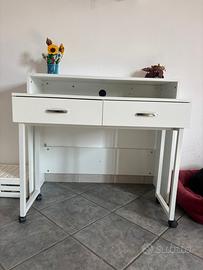 Scrivania/tavolo con due ripiani, di cui uno con ruote in legno facilmente spostabile e collocabile sotto il ripiano più alto per guadagnare spazio. Mobile in ottime condizioni.