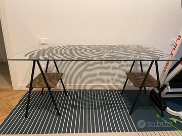 Scrivania in vetro Ikea con due piedistalli e mensole portaoggetti in sughero.