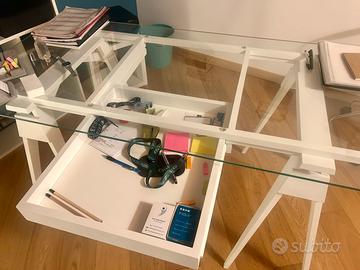 Vendo Scrivania tavolo di vetro design scandinavo, praticamente nuova nemmeno un graffio. Cassetto a vista apribile su entrambi i lati. Non e’ ikea ma infattidi qualita superiore. Dimensioni: 150x 75 cm.
