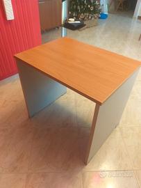 Scrivania ARCA di tipo dattilo con piano colore rovere e supporti in grigio.