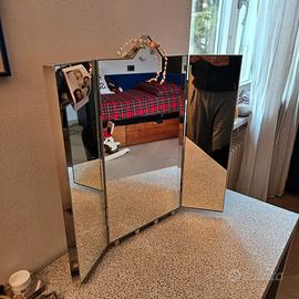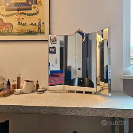 Questo pezzo è noto per le sue linee pulite e geometriche tipiche del periodo, spesso proposto con specchi posizionabili in modo da creare un impatto visivo scultoreo. Essendo un pezzo storico e raro e di probabile rivalutazione, evitare proposte al ribasso; costo da nuovo, rarissima disponibilità: Euro 6000. Sedia non compresa ma disponibile (Driade Aleph design Philippe Starck), anno 1984