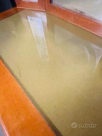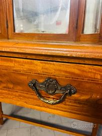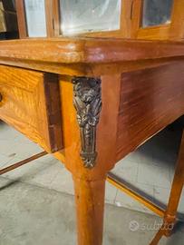 Elegante toilette / consolle / tavolino da ingresso / scrivania anni ’30-40 in legno massello, stile classico, con specchiera originale a tre ante (una centrale e due laterali orientabili), un cassetto frontale con maniglie, piano in vetro e gambe affusolate. In ottime condizioni, senza danni o difetti - cm 90×55, 80 h - specchio: cm 60 h