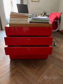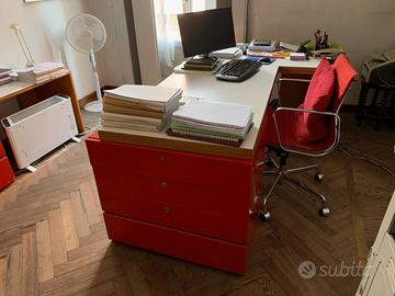 Scrivania ufficio ad angolo in bilaminato, massello e cassettiera 4 cassetti con chiusura laccata rosso. Lati: cm. 121 / 210 / 80 / 72 x h cm. 76