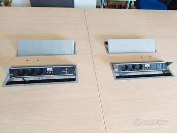 Vendo scrivanie ufficio composte da due parti ciascuna. Finitura superiore effetto legno, bordi bianchi e gambe in metallo. Completa di passacavi (cablaggio a carico dell'acquirente). Dimensioni complessive singola scrivania montata: cm 360 x 160 cm.