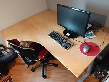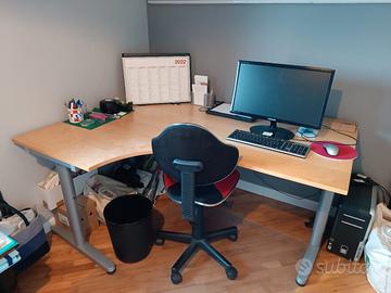 scrivania a forma di "L", lati lunghi cm.160x80 e lati corti cm.120x60; ripiano in legno chiaro e struttura in metallo grigio. In ottimo stato, senza striscia o graffi. Le gambe si svitano facilmente per un comodo trasporto.