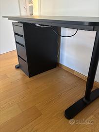 Vendo scrivania nera con annessa cassettiera (non legata alla scrivania). la scrivania è regolabile in altezza, misura 140cm * 60cm e a ora è alta 75cm. Va ritirata a domicilio,( il prezzo del costo di spedizione sono obbligata a metterlo). Per qualsiasi informazione non esistate a contattarmi