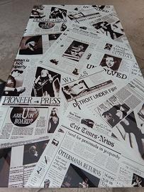 Scrivania con struttura in metallo e piano in cristallo con serigrafie di quotidiani. Dimensioni soddisfacenti cm 113x58x73 di altezza completa di poltroncina ripieghevole. Ottimo per cameretta o ripiego d'ufficio