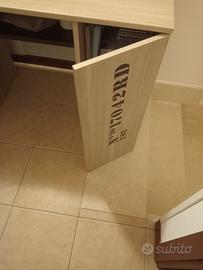 Scrivania poco usata, con un vano sotto al piano di lavoro, un'anta e un cassetto a sinistra e un'anta con un ripiano a destra. Molto capiente e come nuova. Misure larga 1,20 profonda 0,55 alta 0,75
