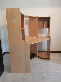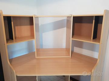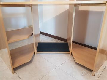 Scrivania usata, in buono stato. Completa di 2 porta cd laterali, poggia piedi, ripiano per tastiera rimovibile, alloggiamento per pc e vari ripiani laterali