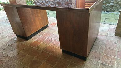 Elegante e imponente scrivania da direttore, autentico pezzo di design italiano in stile Art Déco e Razionalista. Risalente agli anni '30 o '40, questo mobile è caratterizzato da linee pulite e geometriche, che ne sottolineano la funzionalità e la solidità.