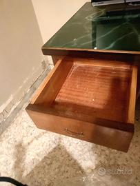 Scrivania vintage in legno massiccio, molto robusta e capiente, con elegante piano superiore in vetro.