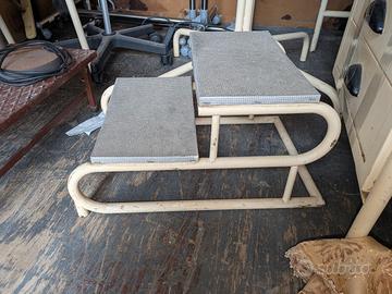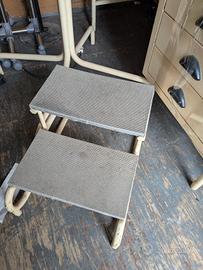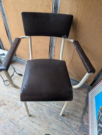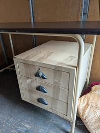 scrivania vintage, tre sedie, un carrellino porta stampante, e una scaletta poggia piedi tutto anni '70, scrivania rivestita in pelle con cassetti, sedie con rivestimento in pelle. segni di usura del tempo. tutto 155 euro trattabili