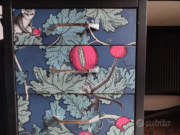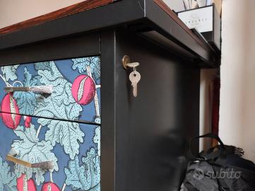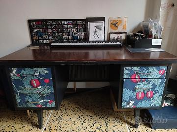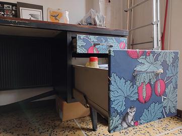 Scrivania anni 70 da ufficio in alluminio con pianale in radica, restaurata con smalto nero e cassetti rivestiti in carta da parati Fornasetti. Bella e indistruttibile Misure: alta 80cm; larga 160cm; profonda 65cm.