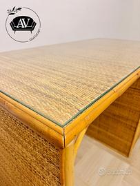 Scrivania vintage anni ’70/’80 in bambù e rattan intrecciato, completa di vetro originale sul piano e cassettiera laterale a 4 cassetti.