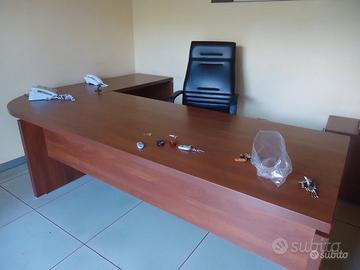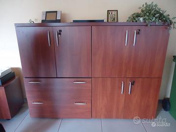 Arredamento da ufficio di ottima qualità, 2 scrivanie in legbo massiccio con tavoli angolari, due cassettiere (3 cassetti ciascuna), 4 mobiletti (con ante) componibili. Prezzo da concordare