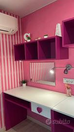Due scrivanie dotate di cassetto e scomparto a giorno 3 librerie a giorno Due specchi inclusi Ottime condizioni Dimensioni scrivania: lunghezza 1,4 m profondita 52 cm altezza 74 cm Prezzo trattabile