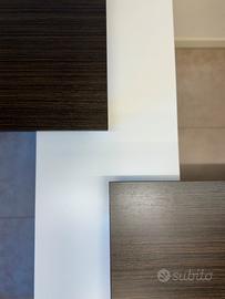 Piani in laminato marrone scuro con venature sottili, struttura e mobili contenitori in bianco opaco.