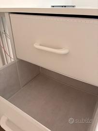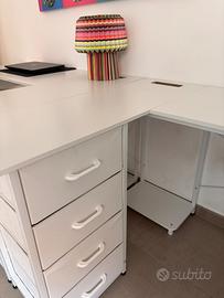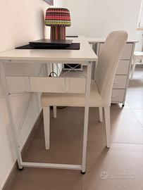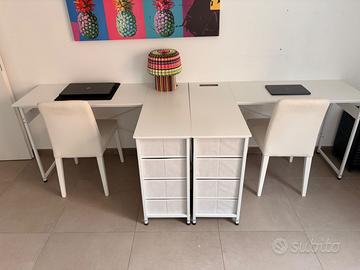 Scrivanie con top in legno vendibili sia in coppia che singolarmente. Il prezzo indicato fa riferimento alla singola scrivania. Misure: Desk principale 135x48 cm Desk laterale (con cassetti) 100x35 cm Altezza 75 cm Le sedie mostrate in foto non sono incluse.