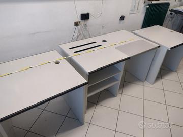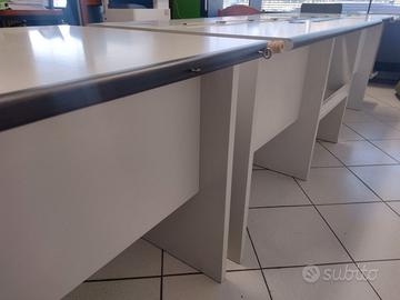 Composizione di complessive 3 scrivanie. Possono essere montate insieme o separatamente. La più grande misura 130 x 78 cm, le due più piccole 78 x 78 cm. Altezza 75 cm. Struttura particolarmente solida, ben conservate.