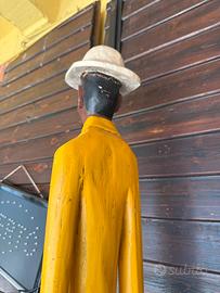 Imponente ed elegante, questa figura stilizzata in legno massello raffigura un personaggio vestito con giacca gialla e cappello bianco, realizzata interamente a mano. Alta ben 2,10 metri, è un’opera decorativa che dona carattere e unicità a qualsiasi ambiente.