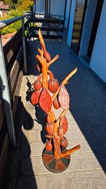 Questa affascinante scultura artigianale in legno, acquistata in Sri Lanka, cattura magnificamente i dettagli della pianta del cacao (Theobroma cacao). È un pezzo distintivo dell'artigianato singalese, spesso realizzato con legni tropicali locali di teak, noto per la sua durezza e le splendide venature.