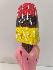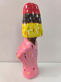 Scultura artistica in ceramica raffigurante una mano rosa che regge un ghiacciolo multicolore, stile Pop Art, design accattivante e colori vivaci. Elemento decorativo d'arredo. Misure 33×13 cm. Articolo Nuovo