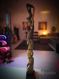 Questa scultura è un dettaglio d'arredo che colpisce per la sua estrema verticalità, alta 52,5 cm con una base di circa 7,5 x 8 cm. Si tratta di una produzione artigianale indonesiana databile con certezza al periodo post anni Novanta, realizzata per il mercato decorativo contemporaneo, ma che riprende con intelligenza le linee dello stile "Pita Maha", il celebre movimento Art Déco Balinese nato negli anni Trenta.