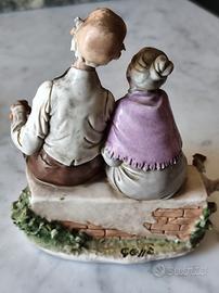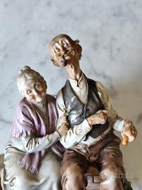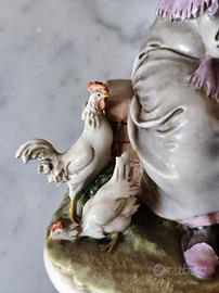 Pregiata scultura d'epoca in porcellana di Capodimonte, firmata dall'artista [Cellè ] e marcata con la tradizionale "N" coronata in blu. L'opera è un esempio magistrale di realismo: raffigura una tenera scena contadina con due anziani seduti su un muretto in pietra, circondati da galline. Straordinaria la cura dei dettagli: dalle rughe dei volti alle pieghe dei vestiti, fino alla resa realistica della paglia e degli animali. Materiale: Porcellana biscuit dipinta a mano. Marchio: N blu coronata sotto la base + Firma incisa dell'artista. Condizioni: Manca la parte superiore del bastone nella mano dell'uomo (facilmente restaurabile)". Stile: Realismo napoletano d'epoca. Dimensioni: [Lunghezza cm. 14 x Altezza cm. 18 ].