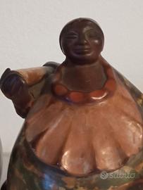 - Antica scultura Chulucanas del Perù fatta a mano, in argilla, colorata. Soggetto: contadina. Artista: Ramon Chero. Firmata sotto la base. Periodo; anni 1970 - 1980. In ottime condizioni. Dimensioni: altezza cm 16 - base diametro cm 5 - larghezza massima cm 10. Chulucanas è una cittadina del Perù famosa per i suoi ceramisti che usano ancora antiche tecniche come per la cottura foglie secche o essicate di banano e di mango che consentono all'argilla di assumere diverse colorazioni e per la lucidatura delle superfici una speciale pietra nera.