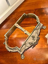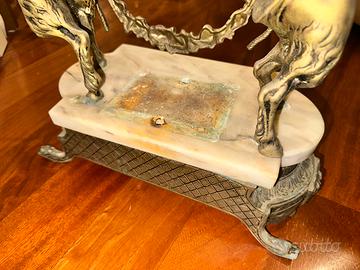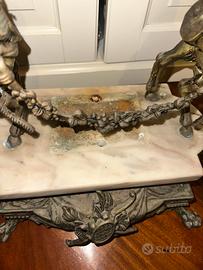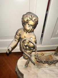 Scultura da tavolo raffigurante due putti (fauni) in bronzo su base di marmo, risalente probabilmente al XIX secolo. Materiali: Bronzo e base in marmo bianco. Soggetto: Due figure infantili che sorreggono una corda. Tipico degli oggetti decorativi d'arte del diciannovesimo secolo. La scultura in precendenza era usata come base di un grande orologio da camino e sia sul marmo che sulla base in bronzo sono presenti le fessure qualora chi acquisterà vorrà metterci un oggetto sopra. ATTENZIONE: come si vede dalle foto, la base in bronzo e quella in marmo sono staccate, ma si riuniscono con due chiodi su misura; inoltre, la corda è appoggiata e non fissata.